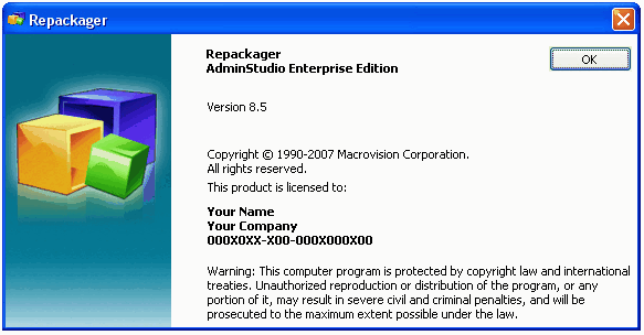 This dialog box available by selecting About Repackager from the Help menu, displays version information for Repackager.