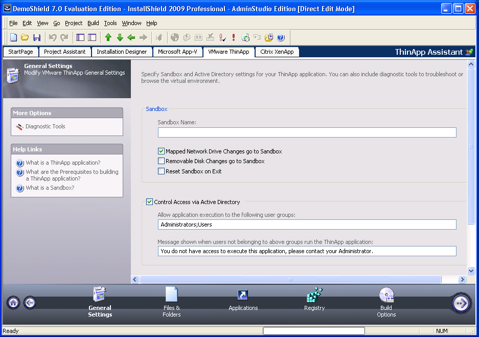 On the General Settings page in the ThinApp Assistant , you specify Sandbox options, including options to control access to the ThinApp application using Active Directory.