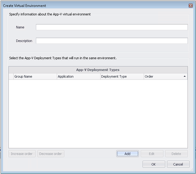 On the Create Virtual Environment dialog box, which is opened by clicking Add on the SCCM Server Environment dialog box, you build a new virtual environment. On this dialog box, you enter the name and description of the virtual environment, and specify the groups of deployment types that will be included in this virtual environment.