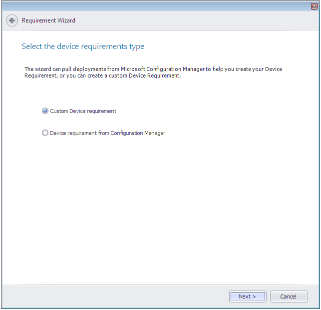 On the Select the Device Requirements Type panel, specify whether you want to create a custom device requirement or select a device requirement from Configuration Manager.