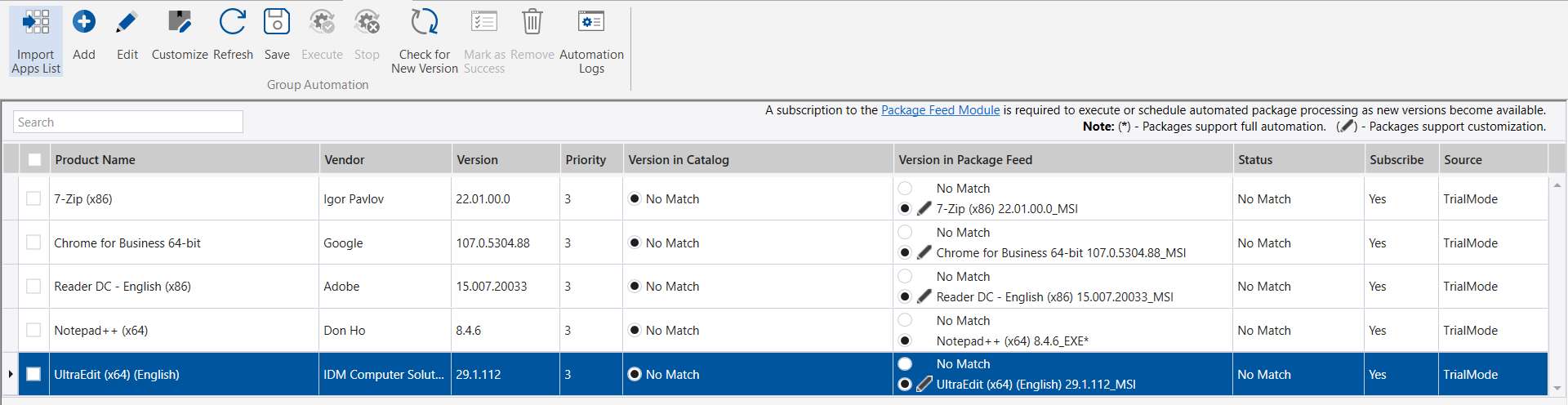 All the Package Feed Module trial packages are by default subscribed for automation by setting the Subscribe column to Yes . If you wish to change, set the Subscribe column to No .