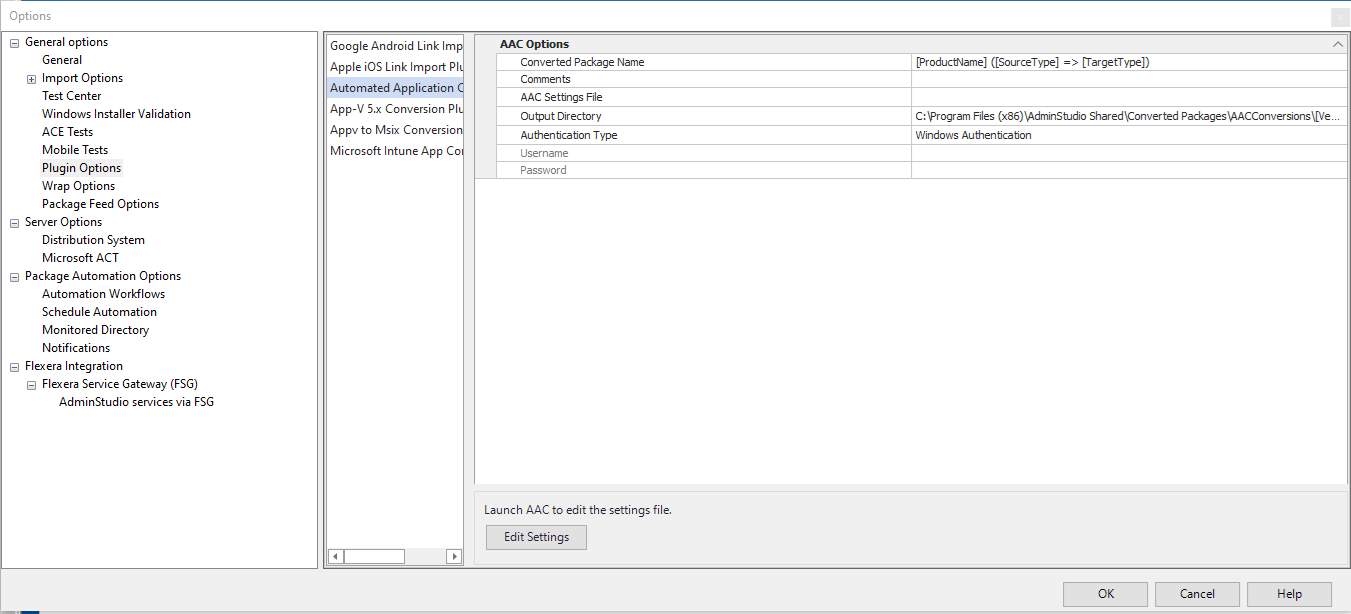 You can easily modify the settings in the default Automated Application Converter Settings file—which is specified on the Plugin Options > Automated Application Converter Plugin tab of the Options dialog box—by clicking the Edit Settings button.