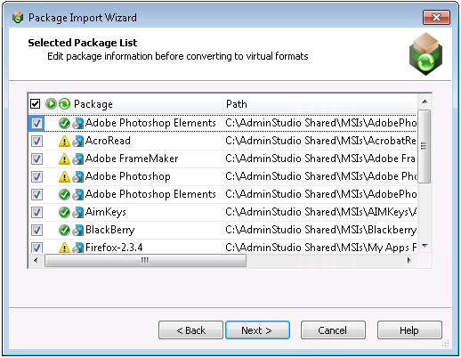 2. On the Selected Package List panel, an icon in the Virtualization Readiness column identifies whether the package requires repackaging prior to conversion to a virtual application: