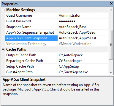 6. In the Properties window under Machine Settings , enter the name of this snapshot in the App-V 5.x Client Snapshot field.
