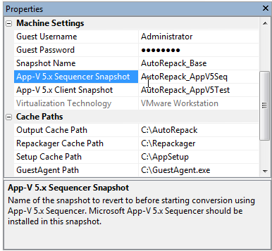 - In the Properties window under Machine Settings , enter the name of this snapshot in the App-V 5.x Sequencer Snapshot field.