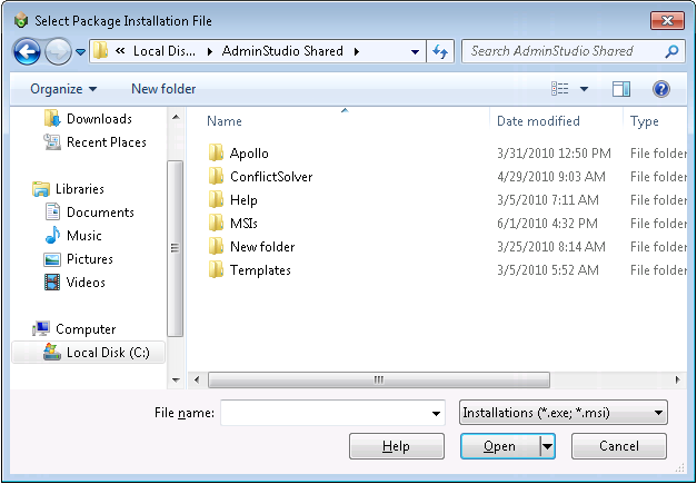 On the Select Package Installation File dialog box, select the installation file (.msi or .exe) or installation script (*.vbs, *.bat, *.cmd, or *.ps1) that you want to add to your project for conversion to a virtual application.