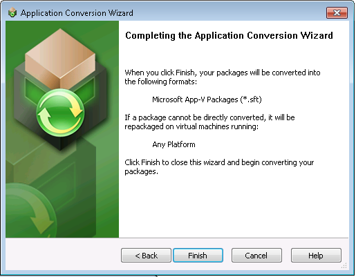 The Application Conversion Wizard Complete panel lists the virtual formats that your selected packages will be converted to, and the operating system platform of the virtual machine that will be used to perform repackaging if repackaging is required during conversion.